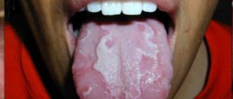 Плотный налет сероватого цвета характерен для дизентерии. При этом язык выглядит потрескавшимся, а слюны выделяется меньше, чем обычно. - Десквамативный глоссит – эта разновидность воспаления языка характерна таким симптомом, как красные пятна полного отсутствия эпителия или несколько измененных вкусовых сосочков на языке, обложенном белым налетом.